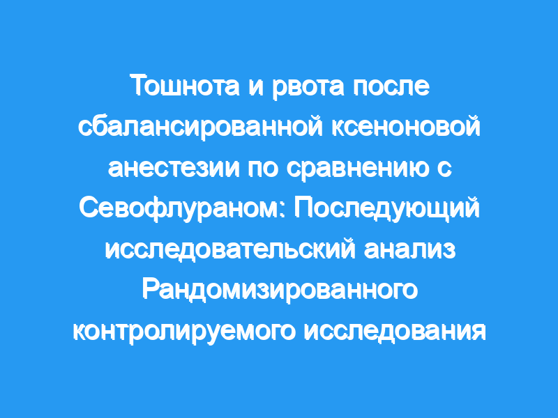 Как и другие ингаляционные анестетики, ксенон, по-видимому, связан с послеоперационной тошнотой и рвотой (PONV). Мы оценили частоту возникновения тошноты после сбалансированной ксеноновой анестезии по сравнению с севофлураном и дексаметазоном для ее профилактики в рандомизированном контролируемом исследовании с последующим исследовательским анализом. 220 пациентов с повышенным риском PONV (оценка Apfel ≥2), перенесших плановую абдоминальную операцию, были рандомизированы для получения анестезии ксеноном или севофлураном и дексаметазоном или плацебо после получения письменного информированного согласия. 93 субъекта в группе ксенона и 94 субъекта в группе севофлурана завершили исследование. Общую анестезию поддерживали 60% ксеноном или 2,0% севофлураном. Дексаметазон в дозе 4 мг или плацебо вводили в течение первого часа. Испытуемых анализировали на тошноту и рвоту с заранее определенными интервалами в течение 24 часов после анестезии.