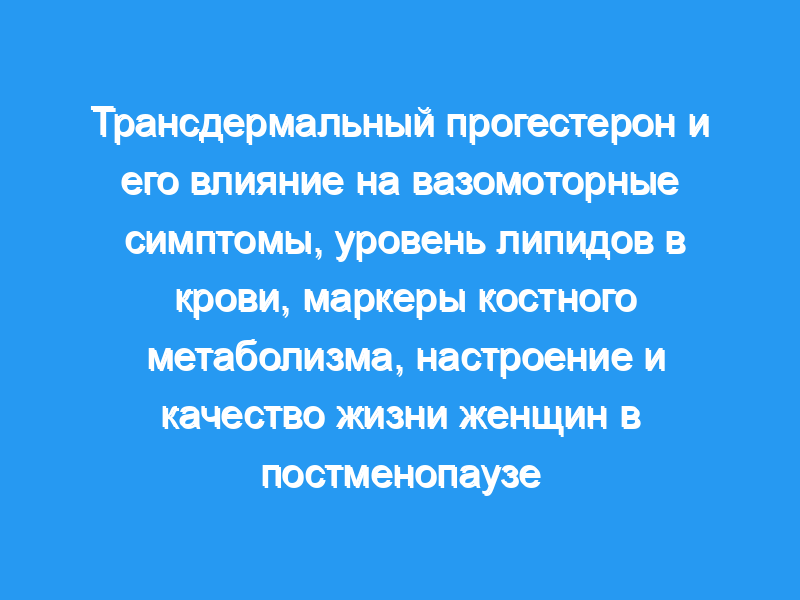 Чтобы определить, оказывает ли трансдермальный прогестероновый крем какое-либо влияние на вазомоторные симптомы, настроение, сексуальную реакцию, уровень липидов в сердечно-сосудистой системе или маркеры минерального обмена в костях. Дизайн: Параллельное двойное слепое рандомизированное плацебо-контролируемое исследование, сравнивающее эффект трансдермального крема, содержащего прогестерон (32 мг в день), с кремом плацебо. Восемьдесят женщин в постменопаузе в Центре менопаузы Королевской женской больницы в Сиднее были случайным образом распределены для получения либо крема с прогестероном, либо плацебо. Их оценивали с помощью климактерической шкалы Грина и опросника качества жизни в период менопаузы, а также анализа крови на содержание липидов и костных маркеров в течение 12 недель. Женщинам назначали крем, содержащий либо прогестерон в дозе 32 мг в день, либо крем-плацебо в течение 12 недель.