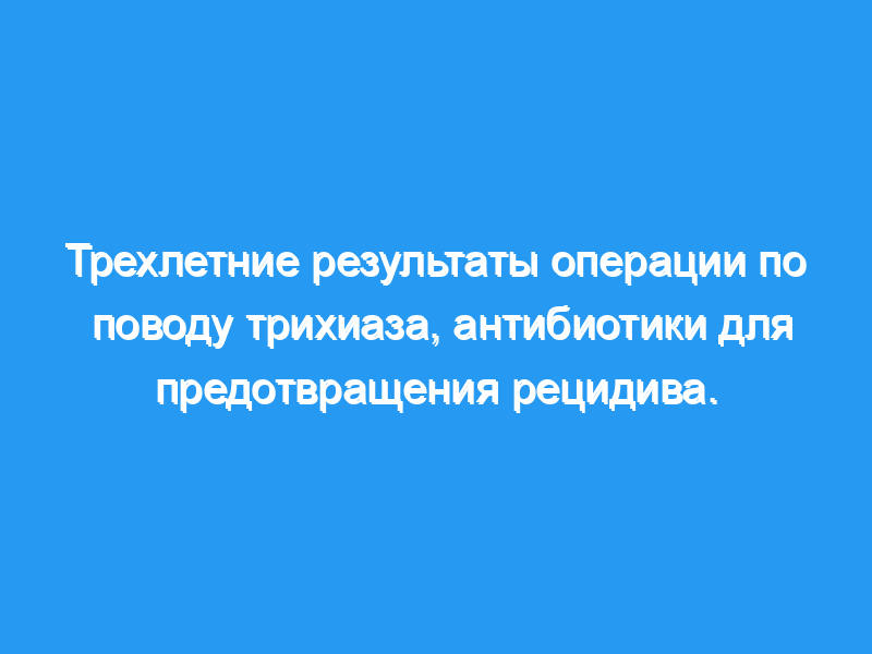 Частота рецидивов трихиаза в исследовании STAR оставалась низкой в течение 3 лет после операции. Защитный эффект однократной дозы азитромицина был меньше, чем через 1 год, и, хотя он не был статистически значимым, все же предполагался до 3 лет после операции по удалению трихиаза. Применение в клинической практике: Однократная доза азитромицина после операции остается неотъемлемым компонентом стратегии Всемирной организации здравоохранения по ликвидации трахомы к 2020 году.