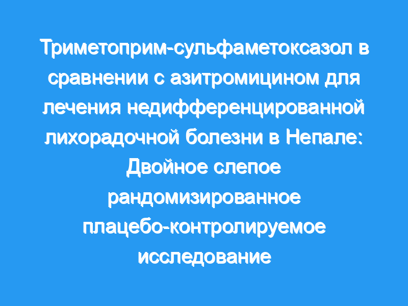 Мы провели двойное слепое рандомизированное плацебо-контролируемое исследование азитромицина (20 мг/кг/сут) или SXT (триметоприм 10 мг/кг/сут плюс сульфаметоксазол 50 мг/кг/сут) перорально в течение 7 дней для лечения UFI в Непале. Мы включили пациентов >,2 года и <,65 лет, поступивших в 2 больницы Катманду с температурой ≥38,0°C в течение ≥4 дней без локализующихся признаков. Первичной конечной точкой было время клиренса лихорадки (FCT), вторичными конечными точками были неудача лечения и нежелательные явления.
