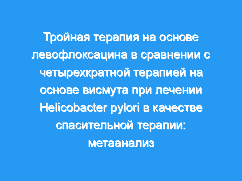 В конечном счете, для мета-анализа были включены семнадцать литературных источников, анализ показал, что частота эрадикации тройной терапии на основе левофлоксацина была выше по сравнению с четырехкратной терапией на основе висмута, но разница не была статистически значимой (77,0% против 68,7%, OR=1,52, 95%ДИ 0,96-2,42, Р=0,34). В европейских странах тройная терапия на основе левофлоксацина была более эффективной, чем четырехкратная терапия (80,6% против 68,5%, OR=2,18, 95%ДИ 1,25-3,81, P<,0,05), в то время как показатели эрадикации в двух группах в азиатских странах были одинаковыми. 7-дневная тройная терапия на основе левофлоксацина и четырехкратная терапия показали сопоставимую эффективность, тогда как 10-дневная тройная терапия на основе левофлоксацина была значительно более эффективной, чем четырехкратная терапия (87,7% против 61,3%, OR=4,92, 95% ДИ 3,09-7,82, P<0,05). Доза левофлоксацина не влияла на эффективность препарата. Побочные эффекты были значительно меньше (19,1% против 29,5%, OR=0,47, 95%ДИ 0,26-0,82, P<0,05), тогда как уровень комплаентности был значительно выше в группе левофлоксацина (96,0% против 89,9%, OR=2,27, 95% ДИ 1,33-3,87, P<0,05).