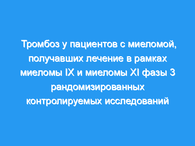 При миеломе IX пациенты, имеющие право на трансплантацию, рандомизированные для индукции циклофосфамида, винкристина, доксорубицина и дексаметазона (CVAD), имели более высокий риск ВТЭ по сравнению с пациентами, получавшими циклофосфамид, талидомид и дексаметазон (CTD) (22,5% [n = 121 из 538] против 16,1% [n = 89 из 554], скорректированный коэффициент риска [aHR] 1,46, 95% доверительный интервал [95% ДИ] 1,11-1,93). У пациентов, не имеющих права на трансплантацию, те, кто был рандомизирован для индукции ослабленной CTD (CTDa), имели более высокий риск ВТЭ по сравнению с теми, кто получал мелфалан и преднизолон (MP) (16,0% [n = 68 из 425] против 4,1% [n = 17 из 419], aHR 4,25, 95% CI, 2,50-7,20). При миеломе XI не было различий в риске ВТЭ (12,2% [n = 124 из 1014] против 13,2% [n = 133 из 1008], aHR 0,92, 95% ДИ 0,72-1,18) или артериального тромбоза (1,2% [n = 12 из 1014] против 1,5% [n = 15 из 1008], ОР 0,80, 95% ДИ 0,37-1,70) между путями, подходящими для трансплантации, у пациентов, получавших циклофосфамид, леналидомид и дексаметазон (CRD) или CTD. У пациентов, не имеющих права на трансплантацию, не было различий в VTE между ослабленным CRD (CRDa) и CTDa (10,4% [n = 95 из 916] против 10,7% [n = 97 из 910], aHR 0,97, 95% ДИ 0,73-1,29). Однако артериальный риск был выше при CRDa, чем при CTDa (3,1% [n = 28 из 916] против 1,6% [n = 15 из 910], aHR 1,91, 95% ДИ 1,02-3,57). Тромботические события произошли почти полностью в течение 6 месяцев после начала лечения.