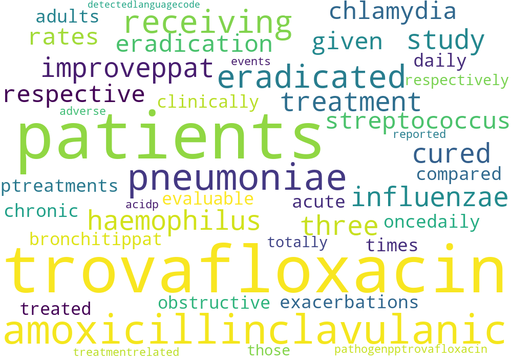 Тровафлоксацин в дозе 100 мг уничтожил Haemophilus influenzae у 91% пациентов, Streptococcus pneumoniae у 100% и Chlamydia pneumoniae у 80%. Соответствующие показатели эрадикации амоксициллина/клавулановой кислоты составили 78%, 100% и 80%. Только 7% (10/144) пациентов, получавших тровафлоксацин в дозе 200 мг, сообщили о побочных явлениях, связанных с лечением, также как и 7% (10/135) пациентов, получавших тровафлоксацин в дозе 100 мг, и 12% (17/140) пациентов, получавших амоксициллин/клавулановую кислоту.