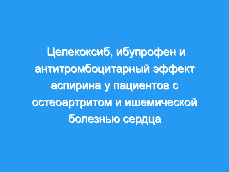 Мы провели плацебо-контролируемое рандомизированное исследование, чтобы выяснить, ослабляет ли целекоксиб или ибупрофен функциональный диапазон ингибирования активности циклооксигеназы тромбоцитов (ЦОГ)-1 аспирином у пациентов с остеоартритом и стабильной ишемической болезнью сердца. Двадцать четыре пациента, которые проходили длительное лечение аспирином (100 мг в день) для кардиопротекции, одновременно получали целекоксиб по 200 мг два раза в день, ибупрофен по 600 мг 3 раза в день или плацебо в течение 7 дней.