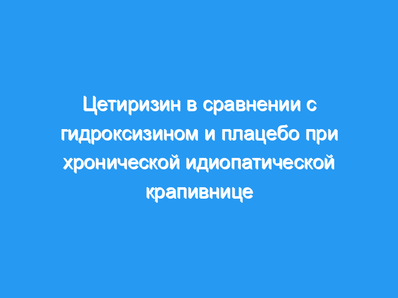 Пациенты проходили лечение в различных условиях аллергологической практики. Пациенты: Исследуемая популяция состояла из 188 пациентов в возрасте не менее 12 лет с симптоматической хронической идиопатической крапивницей, которая эпизодически возникала в течение не менее 6 недель. Вмешательства: Пациентам давали либо цетиризин в дозе 10 мг один раз в день, гидроксизин в дозе 25 мг в сутки, либо плацебо в течение 4 недель. Основные показатели результатов: Пациенты и исследователи использовали 4-балльную шкалу для оценки симптомов крапивницы и побочных эффектов лечения. Оценки сравнивались между теми, кто принимал цетиризин, гидроксизин или плацебо.