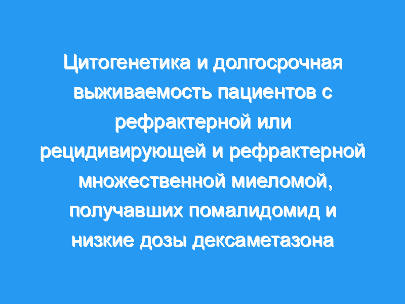 При обновленной медиане наблюдения 15,4 месяца прогрессирование-безрецидивная выживаемость составила 4,0 против 1,9 месяцев (ОР 0,50, P< 0,001), а медиана общей выживаемости составила 13,1 против 8,1 месяцев (ОР 0,72, P=0,009). Помалидомид плюс низкие дозы дексаметазона, по сравнению с высокими дозами дексаметазона, улучшили выживаемость без прогрессирования у пациентов с del(17p) (4,6 против 1,1 месяцев, ОР 0,34, P < 0,001), t(4,14) (2,8 против 1,9 месяцев, ОР 0,49, P=0,028), а также у пациентов со стандартным риском (4,2 против 2,3 месяцев, ОР 0,55, P< 0,001). Хотя большинство пациентов, получавших высокие дозы дексаметазона, принимали помалидомид после прекращения приема, общая выживаемость пациентов, получавших помалидомид плюс низкие дозы дексаметазона или высокие дозы дексаметазона, составила 12,6 против 7,7 месяцев (ОР 0,45, Р=0,008) у пациентов с del(17p), 7,5 против 4,9 месяцев. (ОР 1,12, Р=0,761) у пациентов с т (4,14) и 14,0 против 9,0 месяцев (ОР 0,85, Р=0,380) у пациентов со стандартным риском.