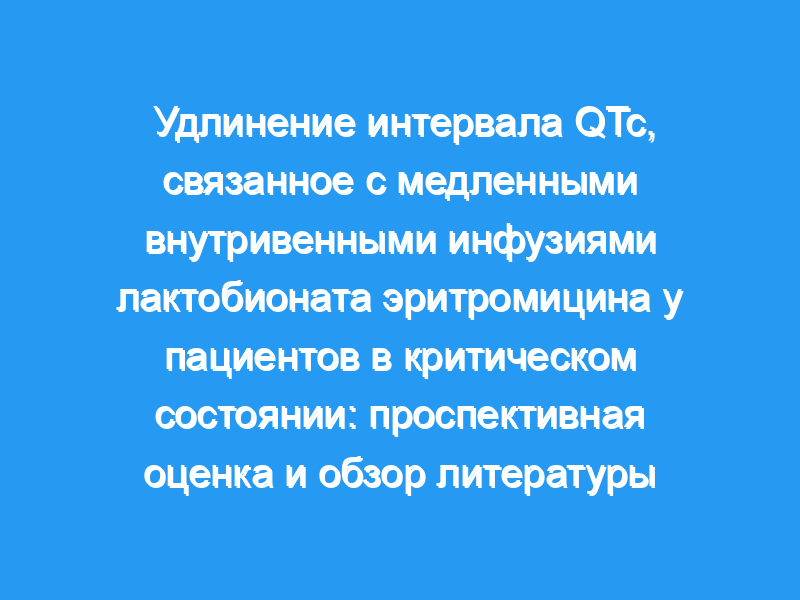 Мы проспективно оценили взаимосвязь между удлинением интервала QTc и введением эритромицина путем медленной внутривенной инфузии (средняя скорость 8.9 +/- 3.5 мг/мин, диапазон 3,9-16,7 мг/мин). Электрокардиографические (ЭКГ) полоски ритма были проспективно получены у 44 тяжелобольных пациентов, получавших внутривенные антибиотики (22 получали эритромицин и 22 цефтазидима, цефуроксима, цефотаксима, цефтриаксона или ампициллин-сульбактама в качестве контроля). Записи ЭКГ были получены непосредственно до и в течение 15 минут после инфузии препарата.