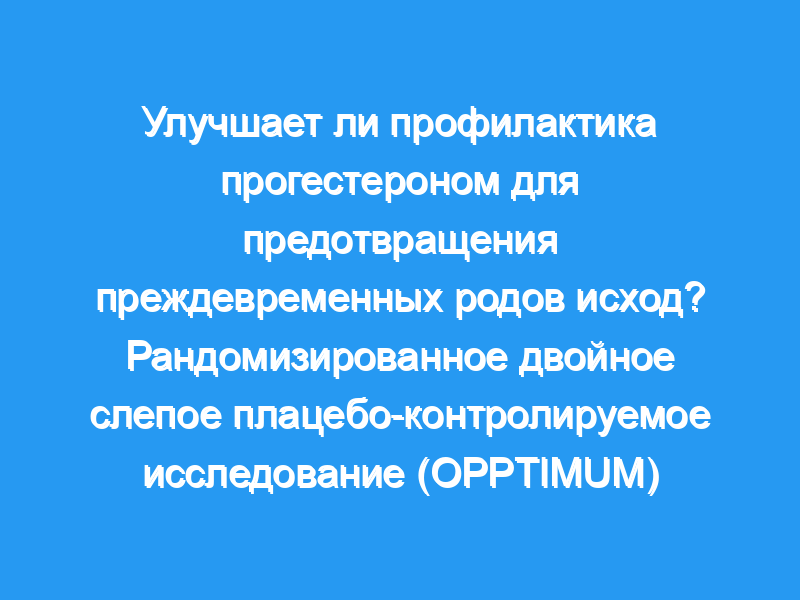 В этом исследовании, прогестерон не оказывал существенного благотворного или вредного воздействия на первичные акушерские, неонатальные или детские исходы.Испытание OPPTIMUM теперь завершено. Мы намерены принять участие во всестороннем мета-анализе данных на уровне отдельных пациентов, изучая женщин с одноплодной беременностью с различными факторами риска преждевременных родов. Регистрация испытаний: Текущие Контролируемые испытания ISRCTN14568373. Финансирование: Это исследование финансировалось Советом по медицинским исследованиям (MRC) и проводилось Национальным институтом медицинских исследований (NIHR) от имени партнерства MRC-NIHR.