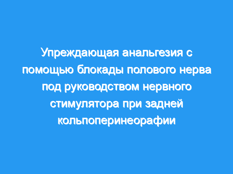 Упреждающая анальгезия с помощью двусторонней ПНБ под управлением нервного стимулятора — это простой и полезный метод, который, как было обнаружено, в сочетании с ГА существенно уменьшает послеоперационную боль и потребление анальгетиков в течение первых 24 часов после операции и сокращает время возвращения к нормальной деятельности по сравнению с одной ГА для пациентов, перенесших заднюю кольпоперинеорафию. Использование PNB также было связано с высокой общей удовлетворенностью пациентов. Таким образом, результаты настоящего исследования могут рекомендовать использование PNB под управлением нервного стимулятора у пациентов с задней кольпоперинеорафией.