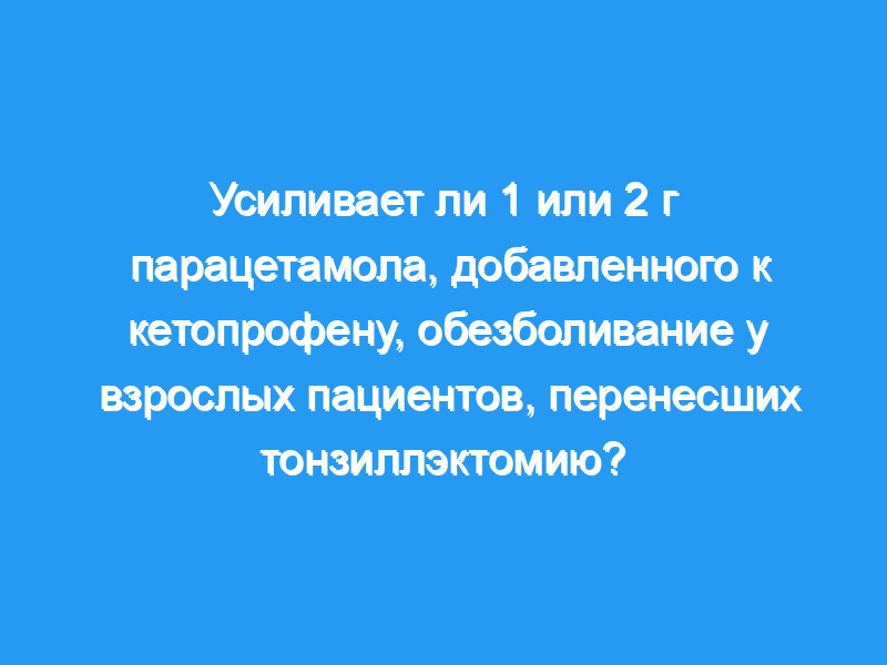 Это проспективное, рандомизированное, двойное слепое и плацебо-контролируемое дополнительное исследование с тремя параллельными группами включало 114 пациентов в возрасте 16-50 лет, которым была запланирована плановая тонзиллэктомия. Всем пациентам после операции внутривенно вводили кетопрофен в дозе 1 мг/кг, а через 5 мин — парацетамол в дозе 1 или 2 г внутривенно или физиологический раствор в качестве плацебо. Основным показателем результата была доля пациентов, которым потребовался оксикодон для экстренной анальгезии в течение первых 6 часов (оценка боли >, 30/100 мм в покое или >,50/100 мм при глотании) после операции.