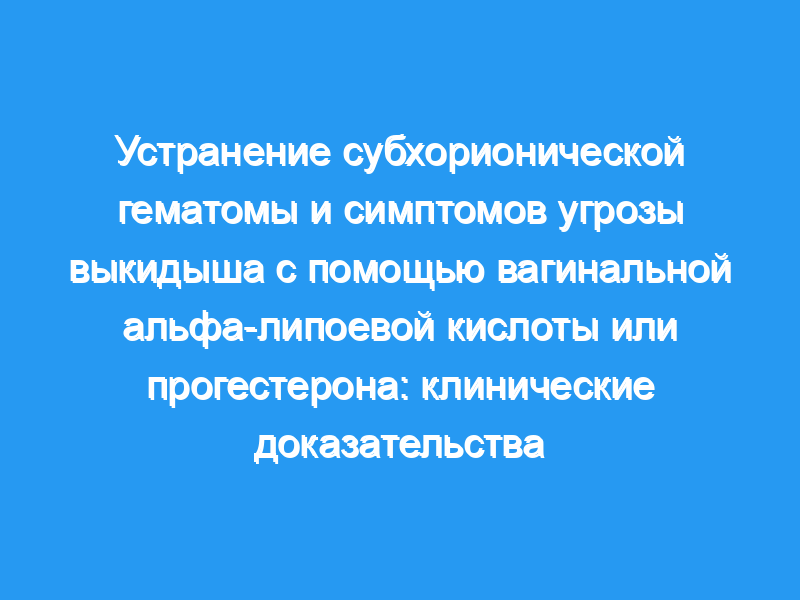 Альфа-липоевая кислота (ALA) — это безопасная природная молекула, которая обладает селективной иммуномодулирующей активностью с антиоксидантными и противовоспалительными свойствами. Это рандомизированное контролируемое клиническое исследование (РКИ) проверяло влияние вагинального введения АЛК или прогестерона на рассасывание субхорионической гематомы у женщин с угрозой выкидыша. Пациенты и методы: шестидесяти двум беременным женщинам в первом триместре беременности с угрозой выкидыша и субхорионической гематомой вводили 400 мг вагинального прогестерона или 10 мг вагинального АЛК. Контрольной группой были пациенты, которые предпочли не получать никакого лечения.