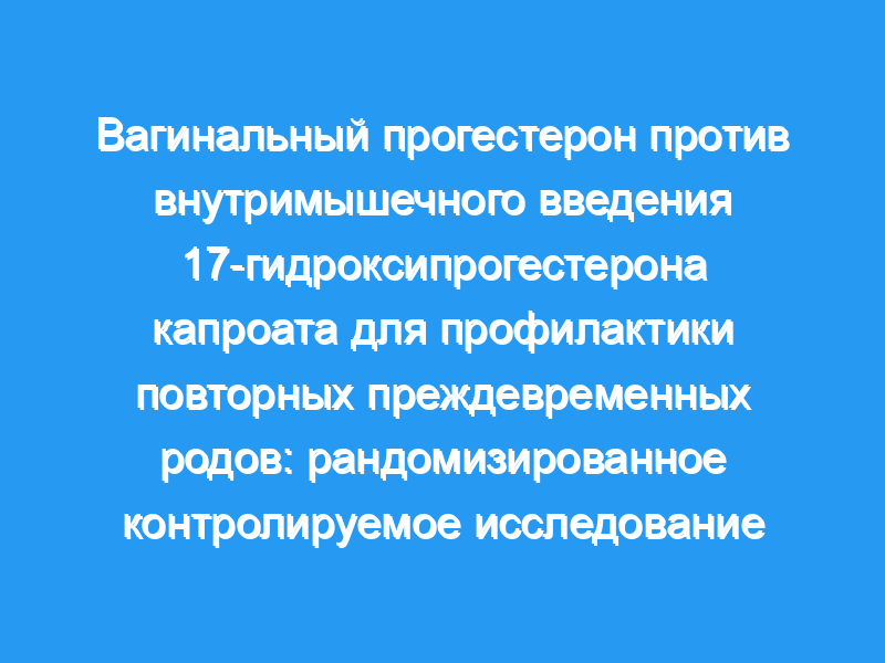 Целью данного исследования было определить, превосходит ли вагинальный прогестерон 17-гидроксипрогестерона капроат в профилактике повторных преждевременных родов у пациенток с одноплодной беременностью, у которых ранее были спонтанные преждевременные роды. План исследования: Это было открытое многоцентровое прагматичное рандомизированное контролируемое исследование в 5 центрах США с участием пациенток с одноплодной беременностью в & lt, 24 недели беременности, у которых ранее были спонтанные преждевременные роды, рандомизированные 1:1 либо на 200 мг вагинальных суппозиториев прогестерона каждую ночь, либо на 250 мг внутримышечного 17-гидроксипрогестерона капроата еженедельно из от 16 до 36 недель беременности. Исходя из предполагаемой частоты повторных преждевременных родов в 36% при применении 17-гидроксипрогестерона капроата, потребовалось 95 участников в каждой группе, чтобы обнаружить 50%-ное снижение частоты преждевременных родов при применении вагинального прогестерона с мощностью 80% и 2-сторонним альфа 0,05. Первичным исходом были преждевременные роды в <, 37 недель беременности. Предварительно определенные вторичные исходы включали преждевременные роды на <,34 и <,28 недель беременности, средний гестационный возраст при родах, неонатальную заболеваемость и смертность, а также показатели приверженности. Анализ проводился с намерением лечить. При необходимости использовались критерий хи-квадрат и t-критерий Стьюдента. P<,0,05 был признан значительным.