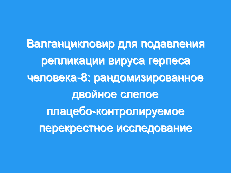 В общей сложности 26 мужчин, инфицированных HHV-8, были рандомизированы для получения 8 недель перорального приема валганцикловира (900 мг один раз в день) или 8 недель перорального приема плацебо. После 2-недельного периода вымывания участники в каждой группе получали исследуемый препарат, который они еще не принимали (либо валганцикловир, либо плацебо), в течение дополнительных 8 недель. Образцы мазков из полости рта собирали ежедневно во время исследования, а ДНК HHV-8 и ЦМВ определяли количественно с помощью ПЦР в реальном времени.