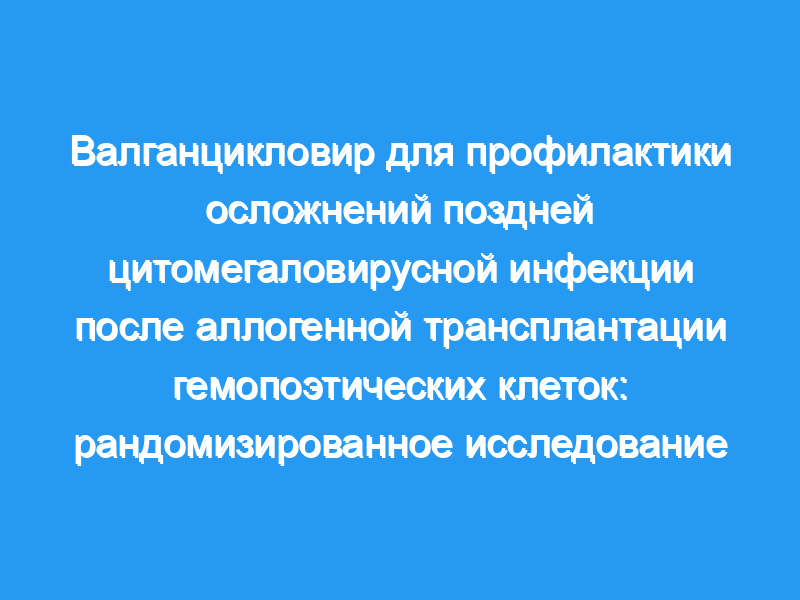 Многоцентровое исследование. Пациенты: 184 реципиента трансплантации гемопоэтических клеток (HCT), которые были подвержены высокому риску поздней ЦМВ-инфекции (95 пациентов получали валганцикловир и 89 получали плацебо). Вмешательство: 6 месяцев валганцикловира (900 мг/сут) или плацебо. Пациенты с положительной полимеразной цепной реакцией 1000 копий/мл или более или с 5-кратным увеличением по сравнению с исходным уровнем получали ганцикловир или валганцикловир (5 мг/кг или 900 мг два раза в день соответственно).
