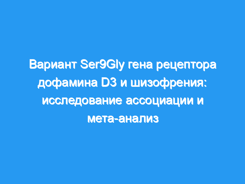 Не было обнаружено существенной разницы между шведскими пациентами и контрольной группой, но была связь между DRD3 Ser9Gly Ser/Ser и гомозиготными генотипами и реакцией на антипсихотические препараты. Этот вывод был подтвержден неполным мета-анализом. В метаанализе всех исследований случай-контроль, включавших 8761 субъекта, сохранялась связь между гомозиготностью по DRD3 Ser9Gly и шизофренией (=4,96, степень свободы =1, p <,0,05, отношение шансов =1,10, 95% доверительный интервал =1,01-1,20). Однако ранее предполагаемая связь между генотипом Ser/Ser и шизофренией не была значимой (chi2 =2,71, степень свободы=1, p>,0,05, отношение шансов =1,08, 95% доверительный интервал = 0,99-1,17).