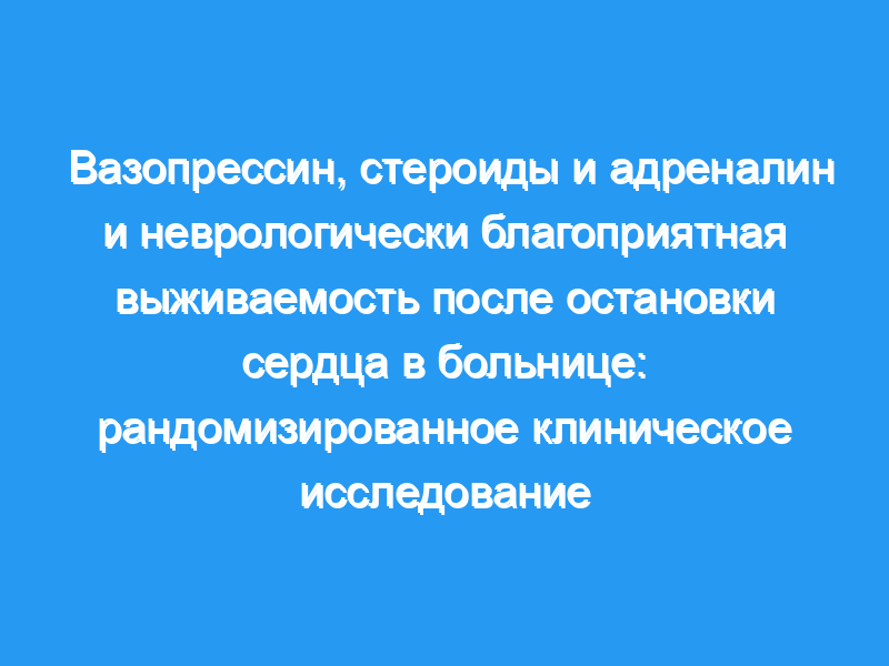 Определить, улучшают ли комбинированные вазопрессин-адреналин во время сердечно-легочной реанимации (СЛР) и кортикостероидные добавки во время и после СЛР выживаемость до выписки из больницы с оценкой по церебральной категории эффективности (CPC) 1 или 2 при вазопрессорной остановке сердца в больнице. Дизайн, условия и участники: Рандомизированное двойное слепое плацебо-контролируемое исследование в параллельных группах, проведенное с 1 сентября 2008 года по 1 октября 2010 года в 3 греческих центрах третичной медицинской помощи (2400 коек) с 268 последовательными пациентами с остановкой сердца, нуждающимися в адреналине в соответствии с рекомендациями по реанимации (из 364 пациенты, оцененные на предмет приемлемости). Вмешательства: Пациенты получали либо вазопрессин (20 МЕ/цикл СЛР) плюс адреналин (1 мг/цикл СЛР, продолжительность цикла около 3 минут) (группа VSE, n = 130), либо плацебо с физиологическим раствором плюс адреналин (1 мг/цикл СЛР, продолжительность цикла около 3 минут) (контрольная группа, n = 138) в течение первых 5 циклов искусственного дыхания после рандомизации с последующим дополнительным приемом адреналина, если это необходимо. Во время первого цикла СЛР после рандомизации пациенты в группе VSE получали метилпреднизолон (40 мг), а пациенты в контрольной группе получали физиологический раствор плацебо. Шок после реанимации лечили гидрокортизоном в стрессовой дозе (максимум 300 мг в день в течение 7 дней и постепенное уменьшение) (группа VSE, n = 76) или плацебо с физиологическим раствором (контрольная группа, n = 73). Основные результаты и показатели: Восстановление спонтанного кровообращения (РОСК) в течение 20 минут или дольше и выживание до выписки из больницы с оценкой CPC 1 или 2.