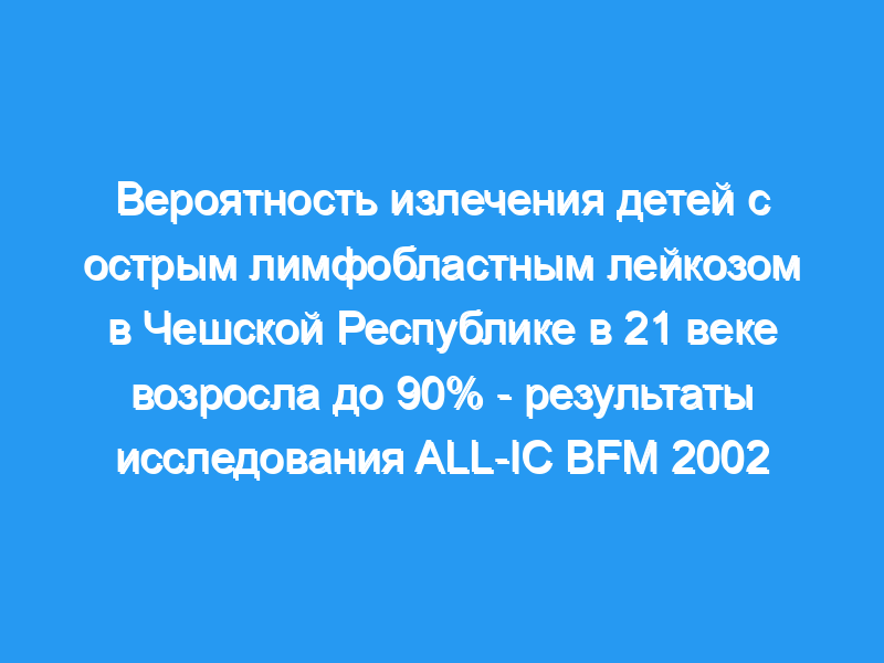 Острый лимфобластный лейкоз (ОЛЛ) является наиболее частым детским злокачественным новообразованием. Лечение было унифицировано в середине 1980-х годов в Чешской Республике. В 2002-2007 годах дети и подростки с острым лимфобластным лейкозом проходили лечение в рамках международного рандомизированного исследования ALL-IC BFM 2002 в Чешской Республике. В исследование был включен 291 пациент в возрасте от 1 до 18 лет, младенцы в возрасте до 1 года были включены в отдельное исследование. Методы и результаты: Пациенты были разделены на три группы риска в соответствии с их возрастом, исходным количеством лейкоцитов, реакцией на преднизолон, наличием слитых генов BCR/ABL или MLL/AF4, D+15 костного мозга и статусом ремиссии D+33. Вся терапия заняла 24 месяца. Рандомизированная поздняя интенсификация сравнивала стандартную терапию BFM с длительным, обычно более интенсивным экспериментальным лечением. Средний срок наблюдения составил 8,7 года. Полная ремиссия была достигнута у 97,9% пациентов, 1% умерли в период ремиссии. У 11% детей случился рецидив, у 1,7% — с поражением ЦНС. У шести детей (2,1%) развилась вторичная злокачественная опухоль. Безрецидивная выживаемость (EFS) через 8 лет после постановки диагноза составила 83,5%, общая выживаемость (OS) 91,4%. EFS и OS групп риска составляли: стандартный риск: 89,4%, 98,1%, средний риск: 82,6%, 89,6%, высокий риск: 68,8%, 78,1%. Мужской пол и возраст старше 10 лет были неблагоприятными прогностическими факторами.