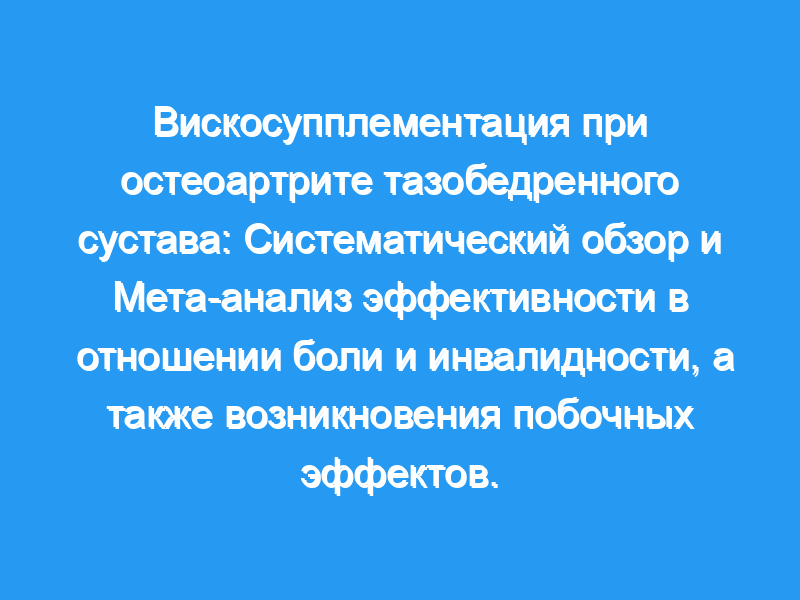 Оценить эффективность вискосупплементации (гиалуроновая кислота [ГК]) в отношении боли и инвалидности, вызванных остеоартритом тазобедренного сустава, и определить возникновение побочных эффектов. Источники данных: PubMed, EMBASE, Кокрейновская библиотека, ClinicalTrials.gov база данных и конкретные журналы до марта 2017 года. Выбор исследования: Рандомизированные контролируемые исследования (РКИ), сравнивающие ГК с любой другой внутрисуставной инъекцией. Извлечение данных: Выполняется в соответствии с критериями рекомендаций, оценки, разработки и оценки Cochrane/Grades. Два автора извлекли данные и оценили риск предвзятости и качество доказательств. Был проведен мета-анализ случайных эффектов. Обобщение данных: Было получено восемь РКИ (n=807): в 4 сравнивали ГК с плацебо, в 3 — с плазмой, богатой тромбоцитами (PRP), в 3 — с метилпреднизолоном и в 1 — с мепивакаином. В некоторых РКИ было 3 руки. Существует очень мало доказательств того, что ГК не превосходит плацебо в отношении боли через 3 месяца (стандартизированная средняя разница [SMD]=-.06, 95% ДИ, от .38 до .25, P =.69), и много доказательств того, что он не превосходит в отношении нежелательных явлений (отношение рисков [RR]=1,21, 95% ДИ, 0,79-1,86, Р=0,38). Существует мало доказательств того, что ГК не превосходит PRP в отношении боли через 1 месяц. Существует очень мало доказательств того, что ГК не превосходит PRP в отношении боли через 6 и 12 месяцев (средняя разница в визуальной аналоговой шкале [в см]: — .05 [95% ДИ, от .81 до .71], 1,0 [95% ДИ, от -1,5 до 3,50] и .81 [95% ДИ, от -1,11 до 2,73] соответственно). Имеются убедительные доказательства того, что ГК не отличается от метилпреднизолона в отношении боли через 1 месяц (SMD=0,02, 95% ДИ, от.18 до .22, P=.85). Существует мало доказательств того, что ГК не отличается от метилпреднизолона по показателям исхода в клинических исследованиях ревматоидного артрита — Международный индекс респондентов Общества по исследованию остеоартрита через 1 месяц (ОР=0,44, 95% ДИ 0,10-1,95, Р=0,28). Имеются убедительные доказательства того, что ГК не отличается от метилпреднизолона в отношении нежелательных явлений (ОР=1,21, 95% ДИ 0,79-1,87, Р=0,38).