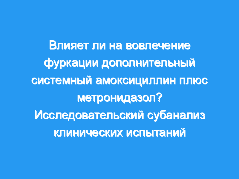 Это исследовательский коллективный субанализ по каждому протоколу из проспективного рандомизированного двойного слепого многоцентрового исследования (ClinicalTrials.gov NCT00707369) о влиянии дополнительного системного применения амоксициллина 500 мг плюс метронидазола 400 мг (3 раза в день, 7 дней) на вовлечение фуркации при пародонтите средней и тяжелой степени тяжести. Результатом стало изменение частоты вовлечения классов фуркации через 27,5 месяцев. Терапия включала механическую обработку в сочетании с приемом антибиотиков или плацебо и поддерживающую терапию с интервалом в три месяца.