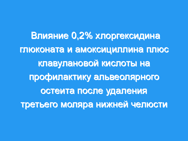 Целью данного исследования было оценить использование 0,2%-ной комбинации хлоргексидина глюконата и амоксициллина плюс клавулановой кислоты в качестве профилактической терапии для профилактики альвеолярного остеита после удаления третьего моляра нижней челюсти и изучить побочные реакции на хлоргексидин. Дизайн исследования: Это рандомизированное, плацебо-контролируемое, параллельное групповое исследование было проведено в группе из 177 испытуемых, из которых были сформированы 3 группы. Первая группа (n = 62) получала 0,2% хлоргексидина глюконат, вторая группа (n = 56) получала 0,2% хлоргексидина глюконат и комбинацию амоксициллин плюс клавулановая кислота, а третья группа (n = 59) получала 0,09% стерильный физиологический раствор. Все пациенты были отозваны для постановки диагноза альвеолярного остеита на третий и седьмой послеоперационные сутки.