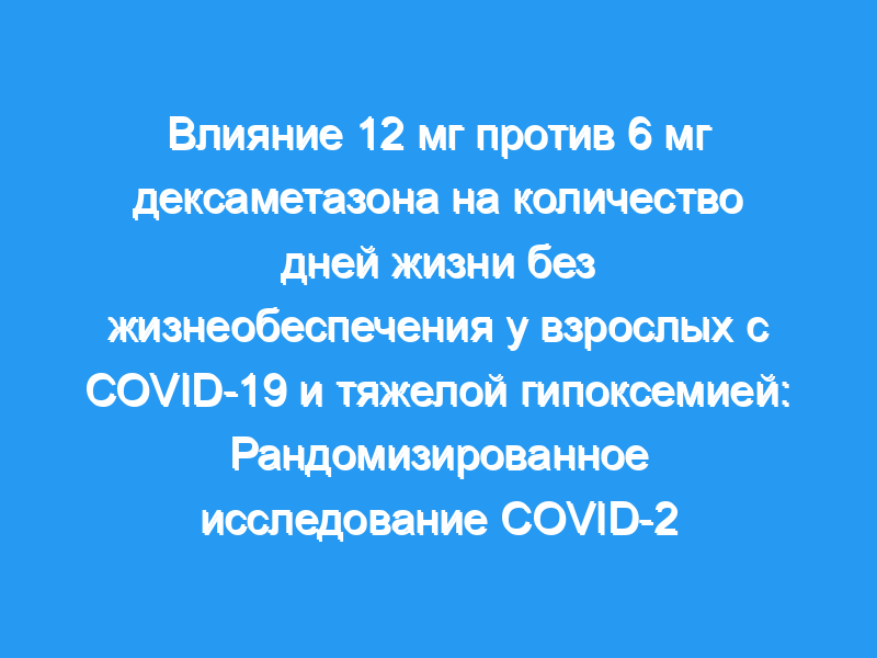 Оценить эффекты 12 мг/сут по сравнению с 6 мг/сут дексаметазона у пациентов с COVID-19 и тяжелой гипоксемией. Дизайн, условия и участники: Многоцентровое рандомизированное клиническое исследование проводилось в период с августа 2020 года по май 2021 года в 26 больницах Европы и Индии и включало 1000 взрослых с подтвержденным COVID-19, которым требовалось не менее 10 л/мин кислорода или искусственной вентиляции легких. Конец 90-дневного наблюдения наступил 19 августа 2021 года. Вмешательства: Пациенты были рандомизированы 1:1 на 12 мг/сут внутривенного дексаметазона (n = 503) или 6 мг/сут внутривенного дексаметазона (n = 497) на срок до 10 дней. Основные результаты и меры: Первичным результатом было количество дней жизни без жизнеобеспечения (инвазивная искусственная вентиляция легких, поддержка кровообращения или заместительная почечная терапия) в течение 28 дней и было скорректировано с учетом переменных стратификации. Из 8 заранее определенных вторичных исходов 5 включены в этот анализ (количество дней жизни без жизнеобеспечения через 90 дней, количество дней жизни вне больницы через 90 дней, смертность через 28 дней и через 90 дней и ≥1 серьезных побочных реакций через 28 дней).