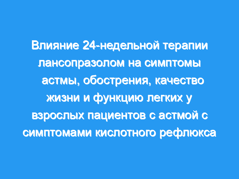 Ежедневные симптомы астмы, использование альбутерола, пиковый поток выдоха, ОФВ1, ФЖЕЛ и симптомы астмы, оцененные исследователем через 24 недели, значительно не улучшились при лечении лансопразолом по сравнению с плацебо. Область эмоциональной функции AQLQS улучшилась через 24 недели (р = 0,025) на фоне терапии лансопразолом. У меньшего числа пациентов, получавших лансопразол (8,1% против 20,4%, соответственно, р = 0,017), были обострения астмы и пероральные кортикостероиды (т.е. от умеренной до тяжелой степени) (4% против 13,9%, соответственно, р = 0,016). Анализ подгрупп post hoc показал, что у меньшего числа пациентов, получавших один или несколько препаратов для длительного контроля астмы в дополнение к ИКС, наблюдались обострения (6,5% против 24,6% соответственно, р = 0,016) и обострения от умеренной до тяжелой степени (2,2% против 17,5% соответственно, р = 0,021). с терапией лансопразолом.