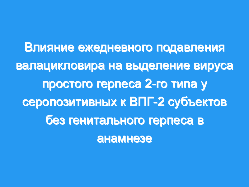 Сравнить влияние валацикловира по 1 г один раз в день в течение 60 дней по сравнению с плацебо на бессимптомное выделение вируса у иммунокомпетентных, серопозитивных к ВПГ-2 субъектов без симптоматической инфекции генитального герпеса в анамнезе. План исследования: Семьдесят три субъекта были рандомизированы для получения валацикловира по 1 г ежедневно или плацебо в течение 60 дней каждый в 2-стороннем перекрестном режиме. Ежедневный мазок из области гениталий был собран самостоятельно для выявления ВПГ-2 методом полимеразной цепной реакции.