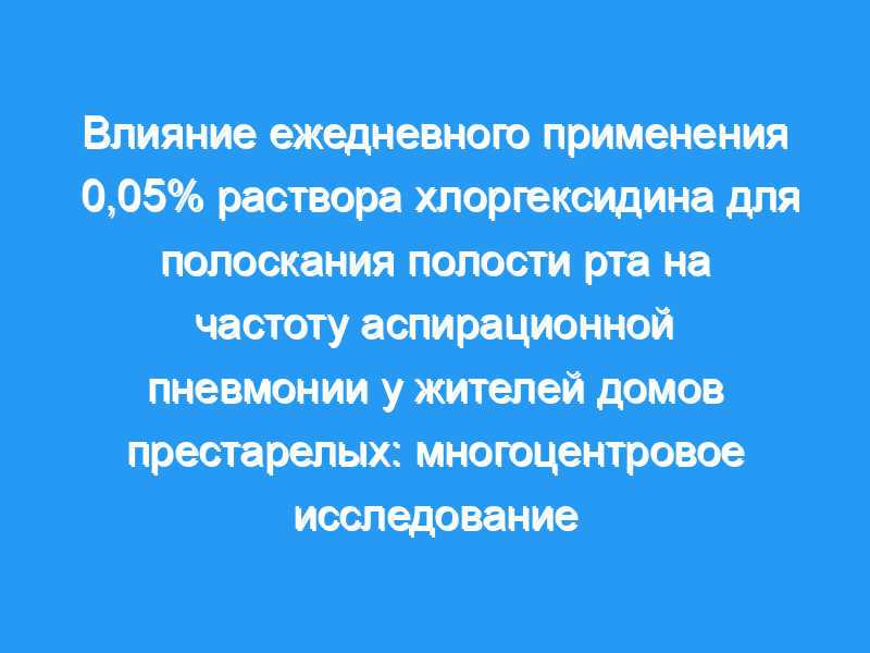 Дисфагия и потенциальные респираторные патогены в биопленке полости рта являются факторами риска аспирационной пневмонии у жителей домов престарелых. Целью исследования было изучить, эффективно ли ежедневное применение 0,05% раствора хлоргексидина для полоскания полости рта в снижении частоты аспирационной пневмонии у пациентов дома престарелых с дисфагией. Также были изучены связи между фоновыми переменными (возраст, пол, тяжесть дисфагии, зависимость от ухода, использование лекарств, количество медицинских диагнозов, зубы и зубные имплантаты, а также ношение съемных протезов) и частотой аспирационной пневмонии.