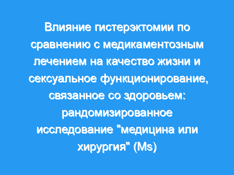 Сравнить влияние гистерэктомии и расширенного медикаментозного лечения на качество жизни, связанное со здоровьем. Дизайн, условия и участники: Многоцентровое рандомизированное контролируемое исследование (август 1997 — декабрь 2000) с участием 63 женщин в пременопаузе в возрасте от 30 до 50 лет с аномальными маточными кровотечениями в течение 4 лет, которые были недовольны медикаментозным лечением, включая ацетат медроксипрогестерона. Участники, которые были пациентами гинекологических клиник и филиалов 4 академических медицинских центров США, наблюдались в течение 2 лет. Вмешательства: Участники были рандомизированы для проведения гистерэктомии или расширенного медикаментозного лечения эстрогеном и/или прогестероном и/или ингибитором простагландинсинтетазы. Способ гистерэктомии и режим лечения были определены участвующим гинекологом. Основные итоговые показатели: Первичным результатом было психическое здоровье, измеренное с помощью Резюме психического компонента (MCS) Краткого обследования состояния здоровья из 36 пунктов (SF-36). Вторичные результаты включали физическое здоровье, измеряемое с помощью сводки физических компонентов (PCS), разрешение симптомов и удовлетворенность, образ тела и сексуальное функционирование, а также другие аспекты психического здоровья и общего восприятия здоровья.