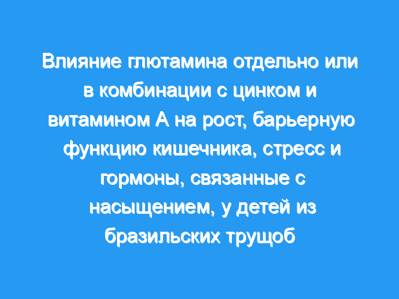 Было проведено рандомизированное двойное слепое плацебо-контролируемое исследование с участием детей в возрасте от двух месяцев до девяти лет из городского сообщества трущоб Форталеза, Бразилия. Была оценена демографическая и антропометрическая информация. Группы случайного лечения, доступные для тестирования (всего 120 детей), были следующими: (1) только глютамин, n = 38, (2) глютамин плюс витамин А плюс цинк, n = 37, и плацебо (цинк плюс носитель витамина А) плюс глицин (изонитрогенный по отношению к глютамину) контроль. лечение, n = 38. Лептин, адипонектин, инсулиноподобный фактор роста (IGF-1) и уровни кортизола в плазме крови измеряли с помощью иммуноферментных анализов, лактулозу/маннит в моче и аминокислоты в сыворотке крови измеряли с помощью высокоэффективной жидкостной хроматографии. ClinicalTrials.gov : NCT00133406.