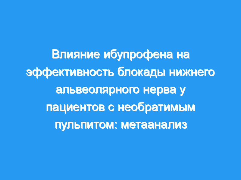 Для мета-анализа осталось всего семь исследований.Введение ибупрофена перед анестезией увеличивало вероятность успеха инъекционной анестезии (ОР = 1,79, 95% доверительный интервал (ДИ) 1,32-2,42, Р = 0,0002) даже в случаях симптоматического необратимого пульпита (ОР = 1,55, 95% ДИ 1,05-2,29, Р = 0,03). Интенсивность боли была ниже при приеме ибупрофена (стандартизированные средние значения различий (SMD) = -3,73, 95% ДИ от -6,43 до -1,04, Р = 0,007). Ибупрофен в качестве премедикации полезен для успешного лечения блокады нижнего альвеолярного нерва.