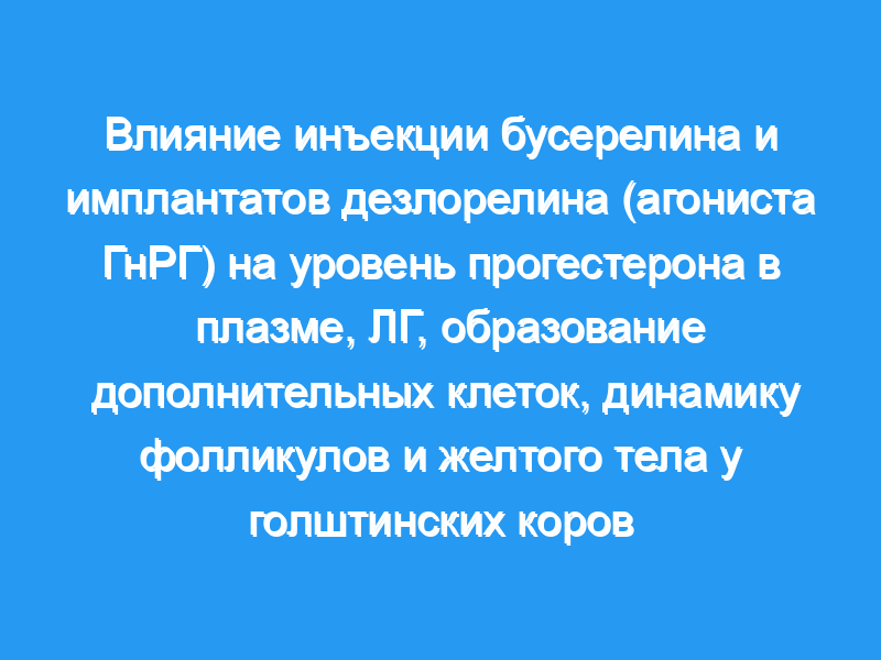 После этого ежедневно проводили ультразвуковое исследование и забор крови (для анализа P4) до спонтанной овуляции до 45-го дня. Большее высвобождение ЛГ происходило в ответ на имплантацию Дезлорелина, чем на инъекцию Бусерелина (P <, 0,01). Базальные уровни ЛГ между 12 и 48 ч были выше в группе DES-700 мкг, чем в группе DES-2100 мкг и Бусерелина (P <, 0,05). Доминантный фолликул первой волны овулировал у всех коров после лечения ГНРГ.
