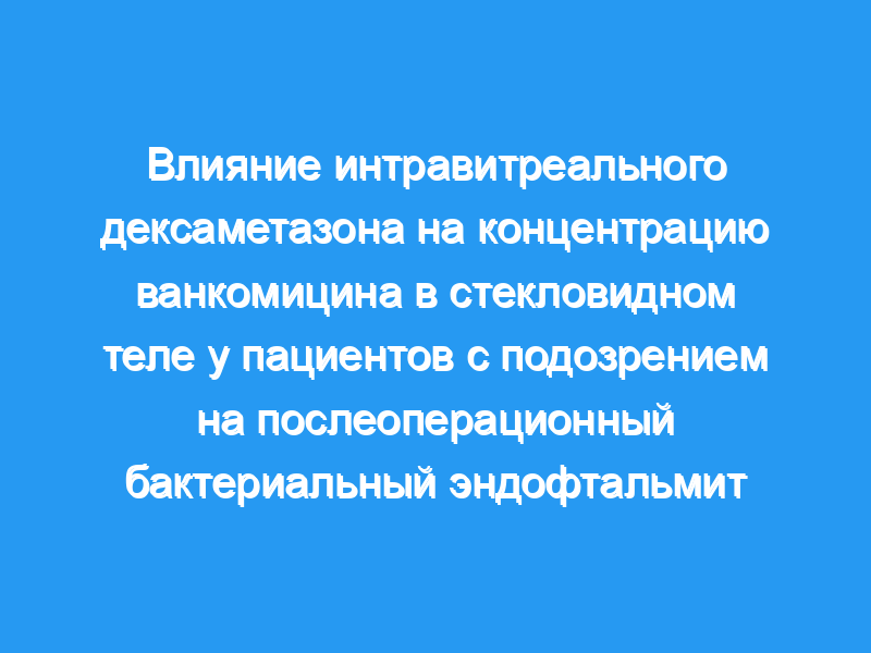 Для изучения интравитреальных концентраций дексаметазона и ванкомицина при совместном применении у пациентов с подозрением на послеоперационный бактериальный эндофтальмит. Исследования на животных показали, что дексаметазон может снижать концентрацию ванкомицина. Дизайн: Проспективное рандомизированное клиническое исследование в специализированном центре.