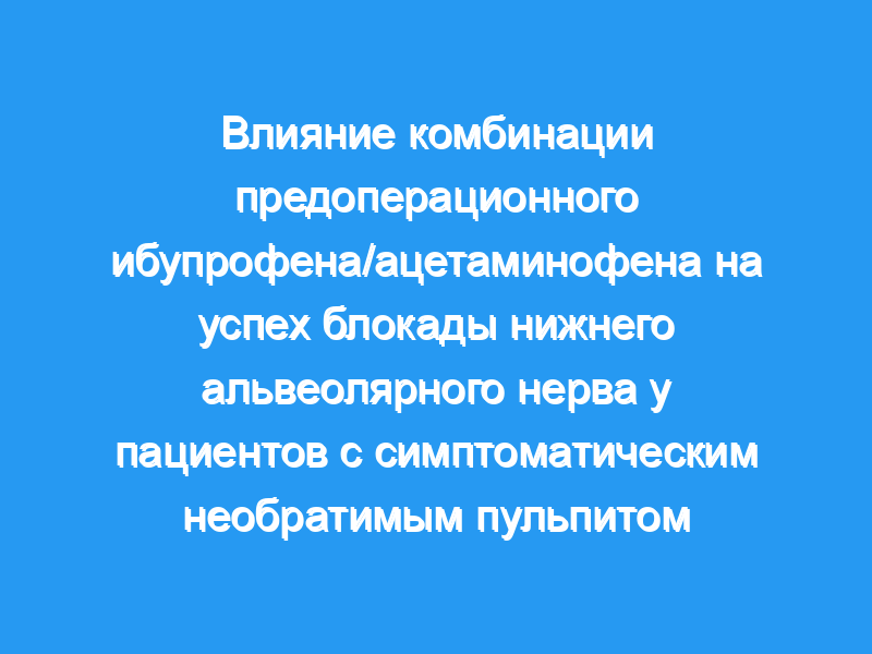 Целью этого проспективного рандомизированного двойного слепого плацебо-контролируемого исследования было определение влияния применения комбинации ибупрофен/ацетаминофен перед операцией на успех блокады нижнего альвеолярного нерва (IAN) у пациентов с симптоматическим необратимым пульпитом.