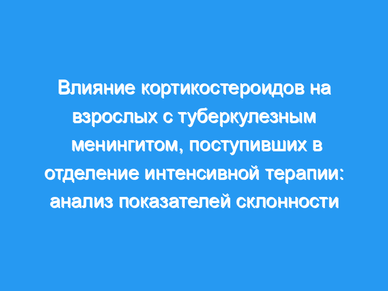 В исследование были включены двести семьдесят пациентов. Средний возраст составил 38+/-17 лет, а шкала комы Глазго составила 12+/-3. Общая смертность составила 43,3%. Девяносто четыре пациента, получавших кортикостероиды, были сопоставлены с 94 пациентами, не получавшими кортикостероиды, по шкале склонности. Исходные характеристики были одинаковыми в двух группах, за исключением гидроцефалии, которая чаще встречалась в группе кортикостероидов. Уровень смертности составил 47,9% в группе кортикостероидов и 52,1% в группе без кортикостероидов (Р=0,77). Летальность у пациентов III стадии, согласно критериям British Medical Research Council, составила 61,5% в группе кортикостероидов против 74,1% в группе без кортикостероидов (Р=0,33). Внутрибольничные инфекции наблюдались у 19,1 пациента на 1000 дней в группе кортикостероидов по сравнению с 16,1 пациентом на 1000 дней в группе без кортикостероидов (Р=0,4). Результат у всех пациентов после поправки на показатель склонности показал одинаковые результаты.