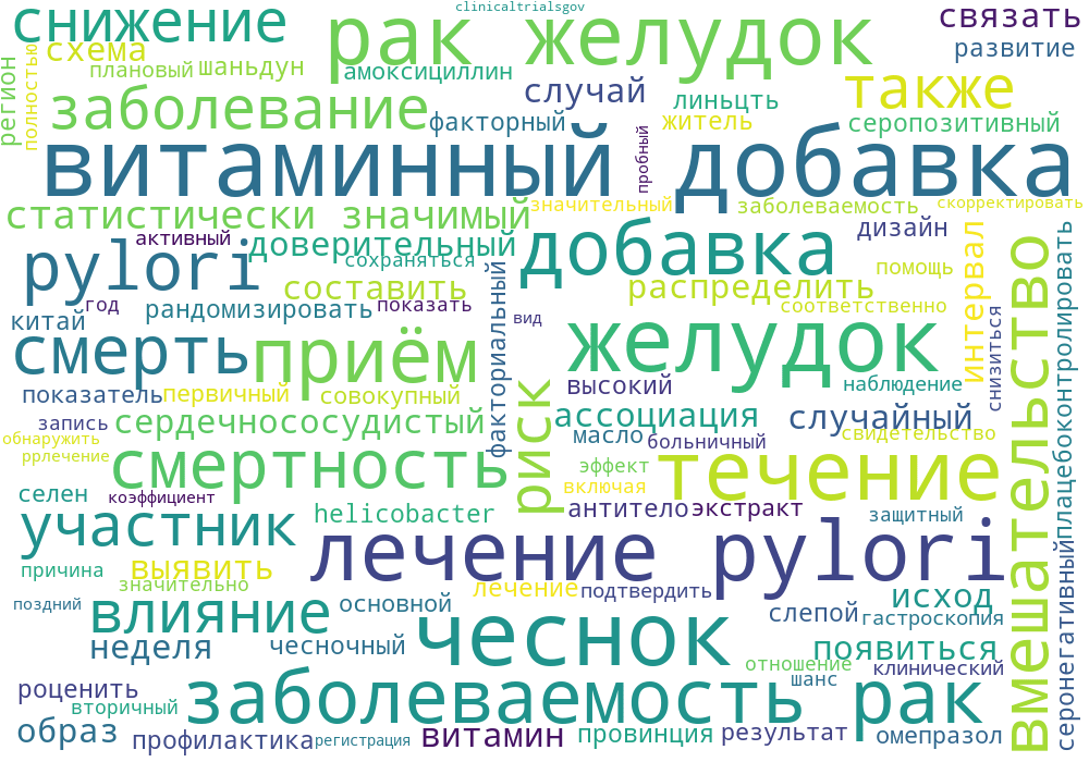 Лечение H. pylori в течение двух недель и прием витаминов или чеснока в течение семи лет были связаны со статистически значимым снижением риска смерти от рака желудка в течение более чем 22 лет. Лечение H. pylori и прием витаминных добавок также были связаны со статистически значимым снижением заболеваемости раком желудка. Пробная регистрация: ClinicalTrials.gov NCT00339768.