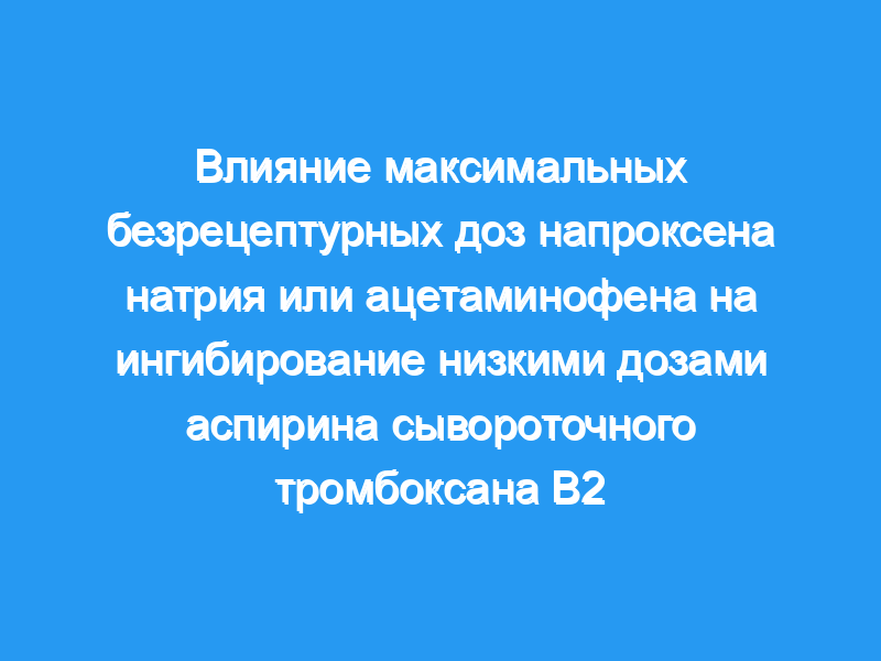 В этом исследовании оценивались ингибирующие тромбоциты эффекты низких доз аспирина, покрытого кишечнорастворимой оболочкой (ЕС-АСК), при одновременном применении с максимальными безрецептурными (безрецептурными) дозами напроксена натрия (НАПСО) или ацетаминофена, чтобы определить, влияют ли НАПСО и ацетаминофен на антитромбоцитарный эффект аспирина.. План и методы исследования: Фаза I, рандомизированное, открытое, многодозовое, трехпериодное, параллельное групповое фармакодинамическое исследование, проведенное на здоровых добровольцах мужского и женского пола (n = 47 рандомизированных субъектов и n = 37 оцениваемых субъектов), средний возраст 40,2 года. Все субъекты получали 5 дней EC-ASA в дозе 81 мг один раз в день, затем 5 дней EC-ASA в дозе 81 мг один раз в день отдельно или совместно с NAPSO в дозе 220 мг три раза в день или ацетаминофеном по 1 г четыре раза в день. Первичный показатель результата: Ингибирование сывороточного тромбоксана B(2) (TXB(2)), как маркера ингибирования циклооксигеназы-1 тромбоцитов (ЦОГ-1), измеренное на 11-й день.