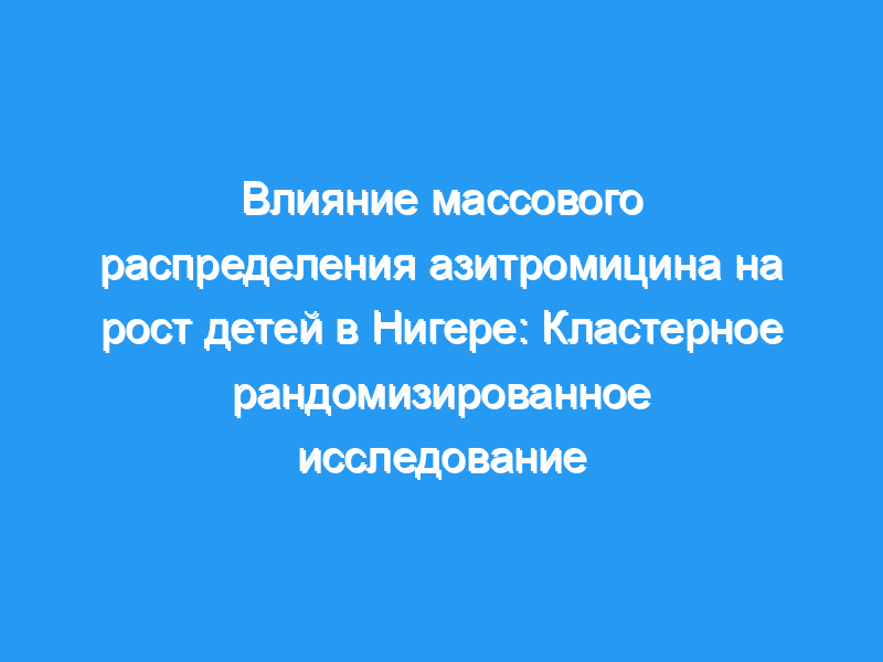 Исследовать, связано ли двухлетнее массовое распределение азитромицина с повышенным ростом у детей. Дизайн, условия и участники: Это кластерное рандомизированное исследование проводилось с декабря 2014 года по март 2020 года среди 30 сельских общин в департаментах Бобойе и Лога в Нигере, Африка, с населением от 200 до 2000 человек. Сообщества были рандомизированы в соотношении 1:1 для двухлетнего массового распределения азитромицина или плацебо для детей в возрасте от 1 до 59 месяцев. Участники, полевые работники и персонал исследования были замаскированы для распределения лечения. Изменения роста и веса от исходного уровня до наблюдения через 4 года сравнивались между группами. Данные были проанализированы с июня по ноябрь 2021 года. Вмешательства: Участники получали азитромицин в дозе 20 мг/кг, используя приближение, основанное на росте, или по весу для детей, неспособных стоять, каждые 6 месяцев в домашних хозяйствах участников. Плацебо содержало носитель суспензии азитромицина. Основные результаты и меры: Продольные антропометрические оценки проводились на случайной выборке детей до первого лечения, а затем ежегодно в течение 5 лет. Рост и вес были заранее определенными первичными исходами.