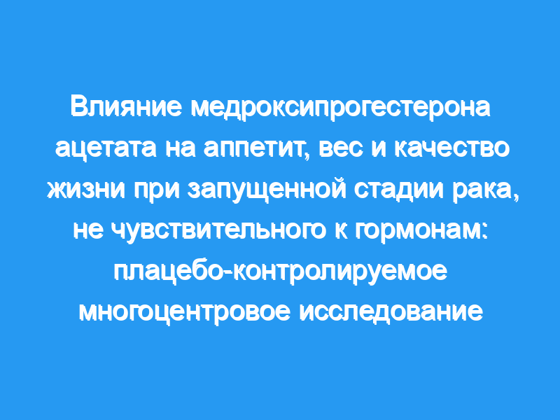 Изучить влияние медроксипрогестерона ацетата (MPA) на аппетит, вес и качество жизни (QL) у пациентов с неизлечимым раком на поздней стадии, не чувствительным к гормонам. Пациенты и методы: Двести шесть подходящих пациентов были рандомизированы между двойным слепым МПА в дозе 500 мг два раза в день или плацебо. Аппетит (числовая шкала оценки от 0 до 10), вес и QL (Опросник качества жизни Европейской организации по исследованию и лечению рака [EORTC-QLQ-C30]) оценивались до начала лечения (t = 0), а также через 6 недель (t = 6) и 12 недель (t = 12) после этого.