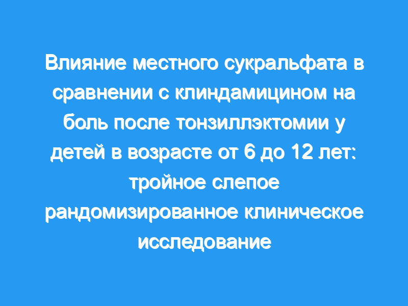 Оценить влияние местного применения сукральфата и клиндамицина на местное уменьшение боли после тонзиллэктомии у детей в возрасте от 6 до 12 лет. Дизайн, условия и участники: Тройное слепое рандомизированное клиническое исследование детей в возрасте от 6 до 12 лет с апноэ во сне или храпом из-за гипертрофии аденотонзилляров и хронической обструкции дыхательных путей или с хроническими инфекциями, которые были кандидатами на тонзиллэктомию в больнице Бесат, Хамаданский университет медицинских наук, с мая по октябрь 2013 года. Вмешательства: Пациенты были рандомизированы для получения жидкости для полоскания рта сукральфатом, жидкости для полоскания рта клиндамицином или плацебо (целлюлоза). Ротовую полость промывали до и сразу после операции 10 мл приготовленного раствора в течение 1 минуты, а затем отсасывали. Затем, через 8 часов после операции, пациентов попросили держать 10 мл приготовленного раствора для полоскания рта во рту в течение 1 минуты 3 раза в день в течение 3 дней. Основные результаты и показатели: Послеоперационная боль в горле оценивалась ежедневно в течение 5 дней с использованием пересмотренной шкалы боли Faces.