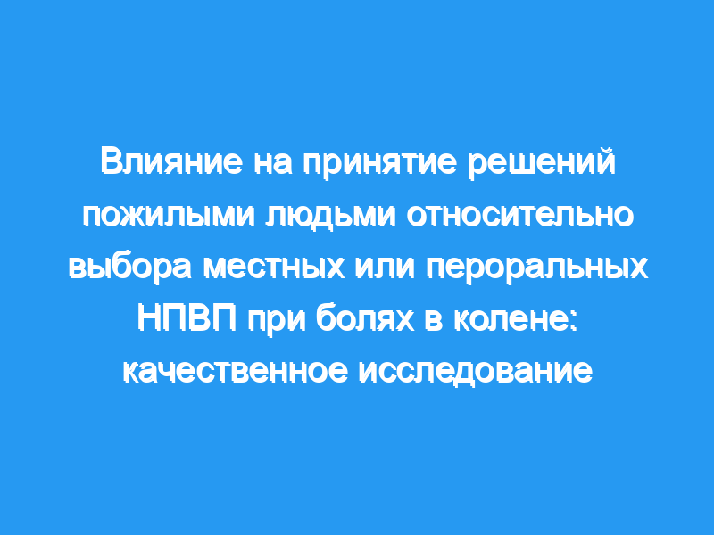 Изучить факторы, влияющие на принятие решений пожилыми людьми относительно местного или перорального применения ибупрофена при болях в колене. Дизайн: Качественное исследование интервью, включенное в рандомизированное контролируемое исследование и исследование предпочтений пациентов, в котором сравнивались рекомендации по применению пероральных или местных нестероидных противовоспалительных препаратов (НПВП) при болях в колене у пожилых людей.