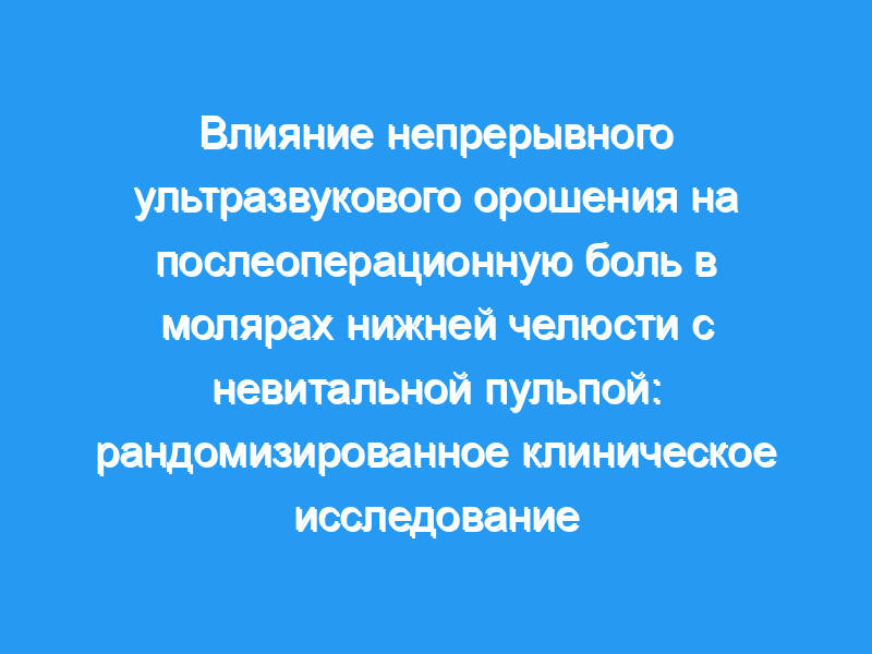 Оценить с помощью рандомизированного клинического исследования влияние непрерывного ультразвукового орошения (CUI) на послеоперационную боль в молярах нижней челюсти с невитальной пульпой. Методика: Семьдесят коренных зубов нижней челюсти с невитальной пульпой и верхушечным периодонтитом были обработаны эндодонтически с использованием двух различных методов орошения. Пациенты были случайным образом распределены в одну из двух групп: CUI (n = 35) и ирригация шприцем (SI) (n = 35). Группа CUI получила активацию ирригатора с использованием пьезопотоковой ультразвуковой иглы Proultra в качестве заключительного протокола орошения, в то время как в группе SI окончательное орошение проводилось с использованием иглы 27-го калибра. Всем пациентам был назначен ибупрофен в дозе 400 мг, который при необходимости следует принимать каждые 8 часов. Послеоперационная боль с использованием визуальной аналоговой шкалы и прием анальгетиков регистрировались ежедневно в течение 7 дней. Данные были проанализированы с использованием тестов хи-квадрат, Манна-Уитни и множественной линейной регрессии.