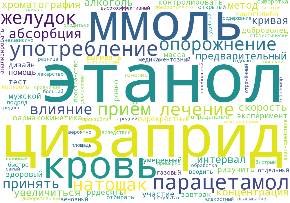 Десять здоровых добровольцев мужского пола приняли участие в эксперименте с перекрестным дизайном. Они выпивали умеренную дозу этанола 0,30 г на 1 кг массы тела ровно через 1 ч после завтрака либо без какого-либо предварительного медикаментозного лечения, либо после приема цизаприда (10 мг три раза в день) в течение 4 дней подряд. В отдельном исследовании та же доза этанола была принята натощак (быстро на ночь). Парацетамол (1,5 г) вводили перед употреблением этанола для контроля опорожнения желудка. Венозную кровь отбирали с интервалом 5-10 мин для определения этанола методом газовой хроматографии в открытом пространстве, а парацетамол анализировали в сыворотке крови методом высокоэффективной жидкостной хроматографии (h.p.l.c.). Результаты Максимальная концентрация этанола в крови (Cmax) увеличилась с 3,8+/-1,7 до 5,6+/-2,3 ммоль l-1 (+/-s.d.) после лечения цизапридом (95% доверительный интервал ДИ при средней разнице 0,28-3,28 ммоль л-1 ). Площадь под кривой концентрации этанола в крови (AUC) увеличилась с 6,3+/-3,5 до 7,9+/-2,6 ммоль л-1 ч после цизаприда (95% ДИ -0. 74-3.9 ммоль л-1 ч). Кривые среднего содержания этанола в крови при приеме цизаприда и без лекарств сходились примерно через 2 ч после начала употребления алкоголя. Как Cmax, так и AUC были самыми высокими при приеме этанола натощак (Cmax 9,5+/-1,7 ммоль л-1 и AUC 14,6+/-1,9 ммоль л-1 ч), по сравнению с употреблением через 1 ч после еды и независимо от предварительной обработки цизапридом.