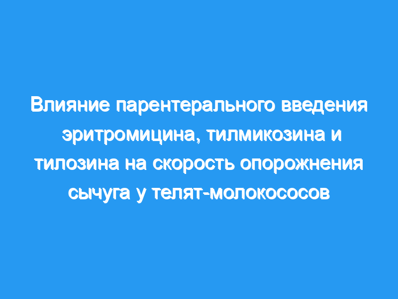 Определить влияние парентерального введения эритромицина, тилмикозина и тилозина на скорость опорожнения сычуга у телят-молокососов. Животные: 8 голштино-фризских телят мужского пола <, возраст 35 дней. Процедуры: Телята получали каждую из 4 обработок в случайном порядке (2 мл физиологического раствора [0,9% NaCl], внутримышечно [контрольная обработка], эритромицин, 8,8 мг/кг, внутримышечно, тилмикозин, 10 мг/кг, SC и тилозин, 17,6 мг/кг, внутримышечно). Через 30 минут телятам скармливали 2 л заменителя молока, содержащего ацетаминофен (50 мг/кг). Периодически после сосания брали образцы яремной венозной крови и трансабдоминальные ультразвуковые размеры сычуга. Скорость опорожнения сычуга оценивали на основе времени до максимальной концентрации ацетаминофена в плазме крови и ультразвукового определения времени перерыва опорожнения сычуга. Однохвостые тесты Даннетта поста проводились всякий раз, когда значение F для группы было значительным.
