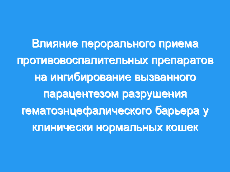 Оценить ингибирующее действие перорально вводимых противовоспалительных препаратов на внутриглазное воспаление, вызванное парацентезом, у клинически нормальных кошек. Животные: 30 клинически нормальных домашних короткошерстных кошек. Процедуры: Кошки были случайным образом распределены в контрольную группу и 4 группы лечения. Кошки в группах лечения получали противовоспалительный препарат перорально один раз в день в 7 часов утра (ацетилсалициловая кислота [40,5 мг/кошка], мелоксикам [0,1 мг/кг], преднизолон [5 мг/кошка] или преднизолон [5 мг/кошка]) в течение 5 дней, начиная за 2 дня до парацентеза-индуцированное разрушение гематоэнцефалического барьера (БАБ) и продолжающееся до 2 дней после парацентеза. Парацентез передней камеры был выполнен в 1 случайно выбранном глазу каждой кошки. Флуорофотометрию проводили в обоих глазах каждой кошки непосредственно перед (время 0) и через 6, 24 и 48 часов после парацентеза.