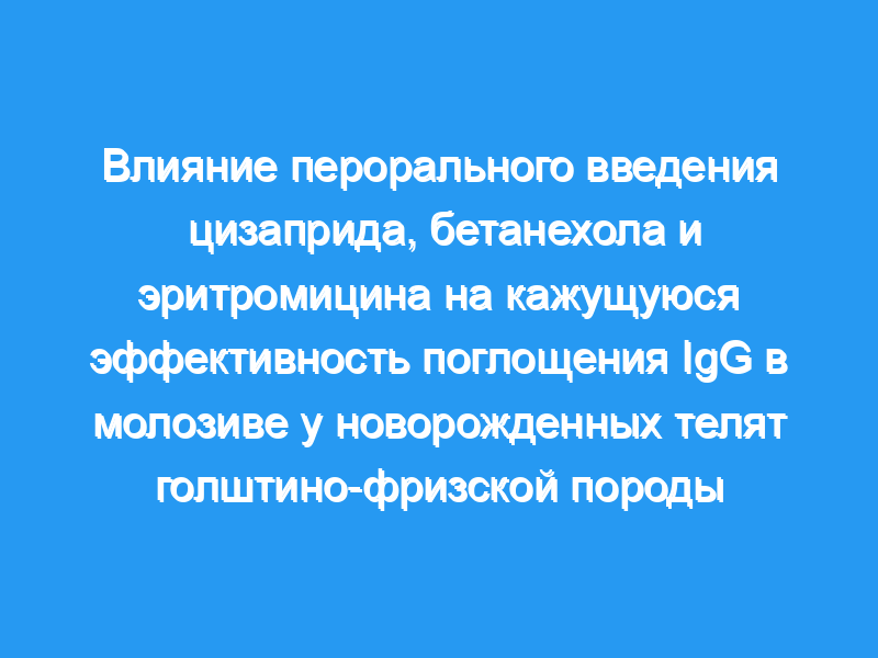 Оценить влияние перорального введения цизаприда, бетанехола и эритромицина на абсорбцию колострального IgG у молочных телят. Животные: Двадцать четыре здоровых новорожденных голштино-фризских теленка. Процедуры: Телятам случайным образом назначали одну из следующих обработок: 0,9% раствор NaCl (2 мл, перорально, отрицательный контроль), лактобионат эритромицина (20 мг/кг массы тела, перорально, ожидается положительный контроль), цизаприд (0,5 мг/кг массы тела, p.o.), бетанехол хлорид (0,5 мг/кг массы тела, p.o.). Телятам скармливали 3 л объединенного коровьего молозива, содержащего ацетаминофен (50 мг/кг), путем сосания и интубации рото-пищевода через 30 минут после каждой обработки. Периодически после начала кормления брали образцы яремной венозной крови и определяли концентрации общего IgG, белка, ацетаминофена и глюкозы в плазме. Скорость опорожнения сычуга оценивали по времени достижения максимальной концентрации ацетаминофена в плазме крови.