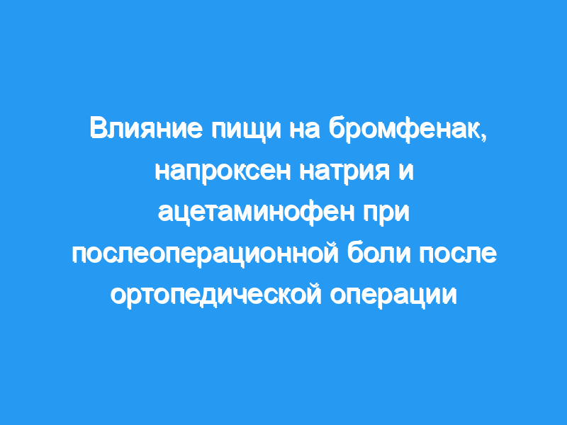 Две палаты отделения ортопедической хирургии Центральной больницы Карлстада, Швеция. Пациенты: Триста десять пациентов с постоянной, умеренной или сильной болью в течение 72 часов после ортопедической операции. Вмешательства: Пациенты были рандомизированы как на получение стандартного приема пищи или натощак, так и на лечение однократной пероральной дозой бромфенака 25 мг, напроксена натрия 550 мг или ацетаминофена 325 мг, когда они испытывали устойчивую, умеренную или сильную боль, требующую анальгетика. Используя запись самооценки, испытуемые оценивали свою боль и ее облегчение в течение 8 часов после приема лекарств. Образцы крови были взяты у всех пациентов по одной из двух схем. Измерения и основные результаты: Пиковая концентрация бромфенака в плазме крови у пациентов, получавших пищу, составляла всего 28% от таковой у пациентов, получавших пищу натощак. Независимо от приема пищи, бромфенак в дозе 25 мг и напроксен натрия в дозе 550 мг значительно превосходили ацетаминофен в дозе 325 мг по всем суммарным показателям обезболивания. Бромфенак и напроксен превосходили ацетаминофен к 1 часу, и эта разница сохранялась в течение 8 часов. Прием пищи снижал обезболивающий эффект бромфенака, но не напроксена или ацетаминофена, лечение взаимодействием с приемом пищи было значительным по пяти показателям эффективности. Анальгетический ответ у пациентов, получавших бромфенак, по сравнению с теми, кто получал его натощак, колебался в пределах 37-71%. Процент пациентов, сообщивших о побочных эффектах, был значительно выше для бромфенака (25%) и напроксена (24%), чем для ацетаминофена (12%).