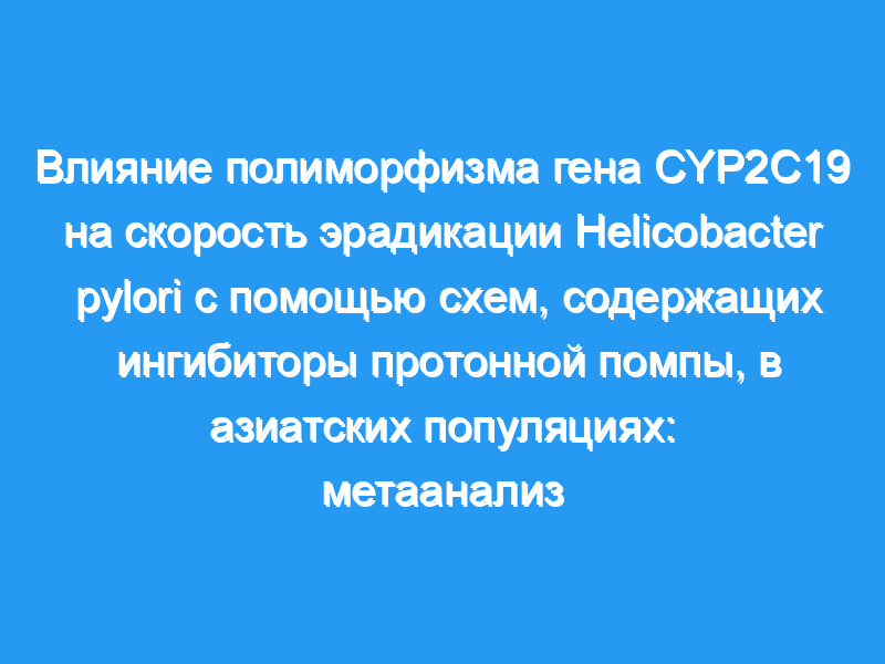 Показатели эрадикации Helicobacter pylori генотипа с низким уровнем метаболизма (PM) были самыми высокими у лиц азиатского происхождения, получавших тройную или четырехкратную терапию первой линии на основе ИПП (p <, 0,05). Полиморфизм CYP2C19 может влиять на скорость эрадикации H. pylori только в материковом Китае и Японии (p <, 0,05).