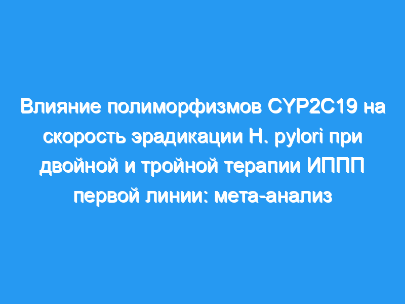 Предпосылка: Было высказано предположение, что различия в показателях эрадикации Helicobacter pylori, связанные с ингибиторами протонной помпы (PPI), частично обусловлены полиморфизмами CYP2C19, и в этой области имеются противоречивые данные. Мы провели метаанализ, чтобы изучить доказательства связи CYP2C19 с показателями эрадикации H. pylori первой линии.