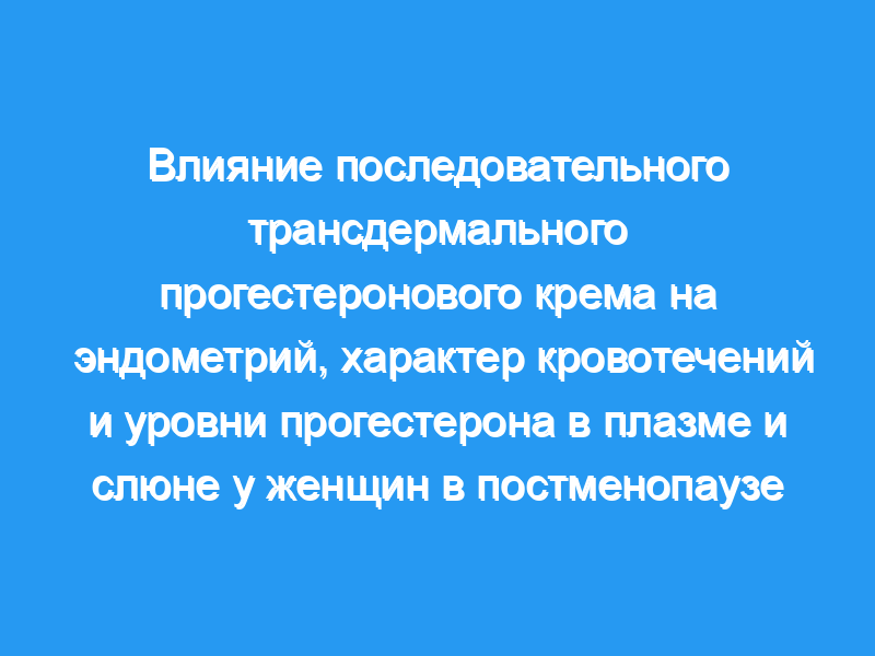 Трансдермальный прогестерон используется в некоторых странах в качестве предполагаемого лечения симптомов менопаузы, либо отдельно, либо назначается в сочетании с эстрогеном, но существует мало информации о биологической активности и эффективности этого метода доставки прогестерона для защиты эндометрия от избыточной пролиферации. Это исследование было разработано для оценки использования последовательного трансдермального прогестерона. Оцениваемые конечные точки включали клеточный ответ эндометрия и характер кровотечения, а также уровни гормонов в плазме и оценку прогестерона в слюне. Способ: Двадцать семь женщин в постменопаузе получали непрерывное трансдермальное введение эстрогена (28-дневный цикл) и крема, содержащего 16, 32 или 64 мг прогестерона в каждой 4-сантиметровой экструзии из тюбика Pro-Feme, вводимого ежедневно в последовательном режиме (дни 15-28 цикла). Образцы крови и эндометрия анализировали на прогестероновую реакцию до начала терапии, после первых 14 дней бесконтрольного трансдермального введения эстрогена и после 14 дней трансдермального введения прогестерона. Образцы слюны были взяты в течение последних 14 дней 84-дневного исследования, когда применялась заключительная терапия кремом с прогестероном.